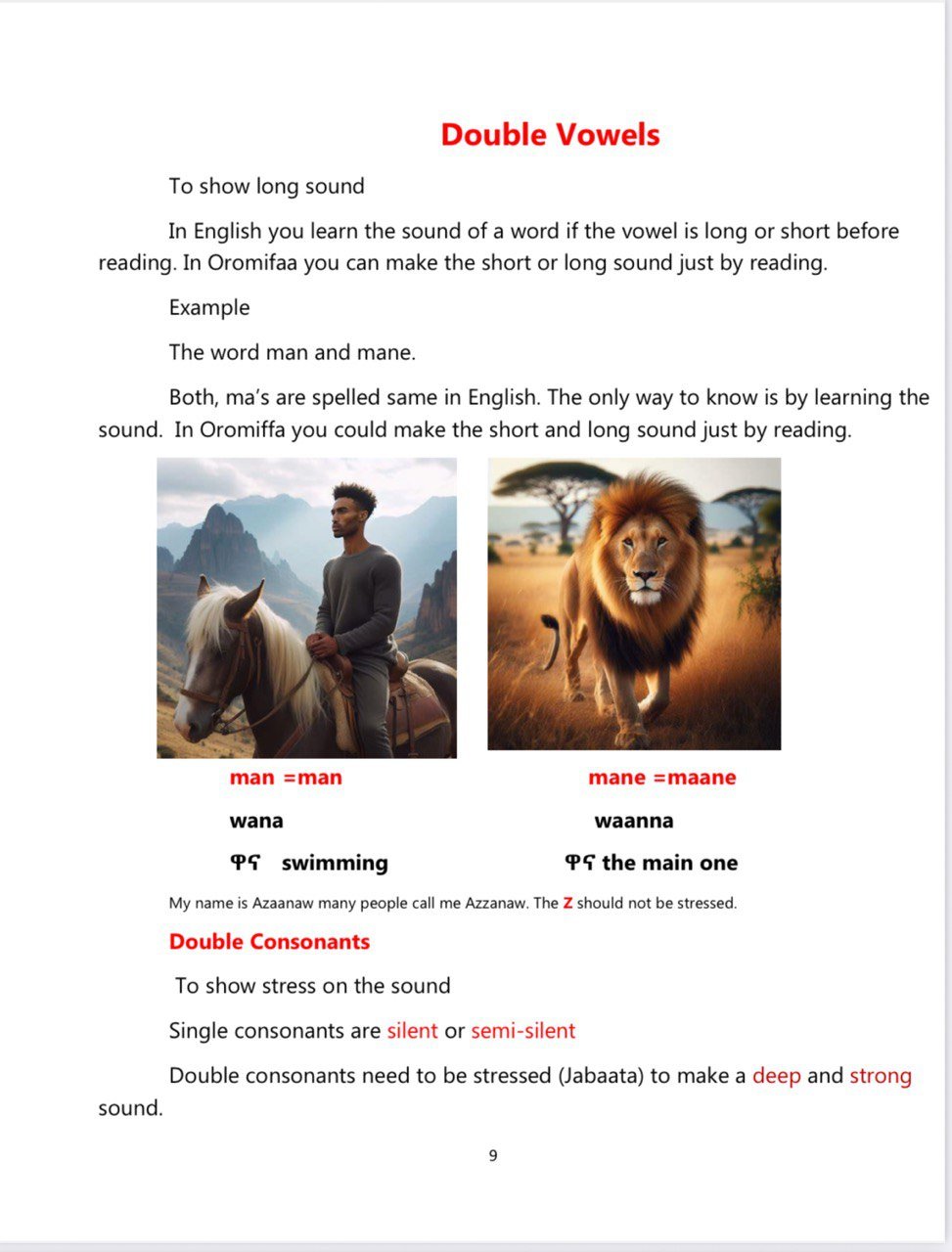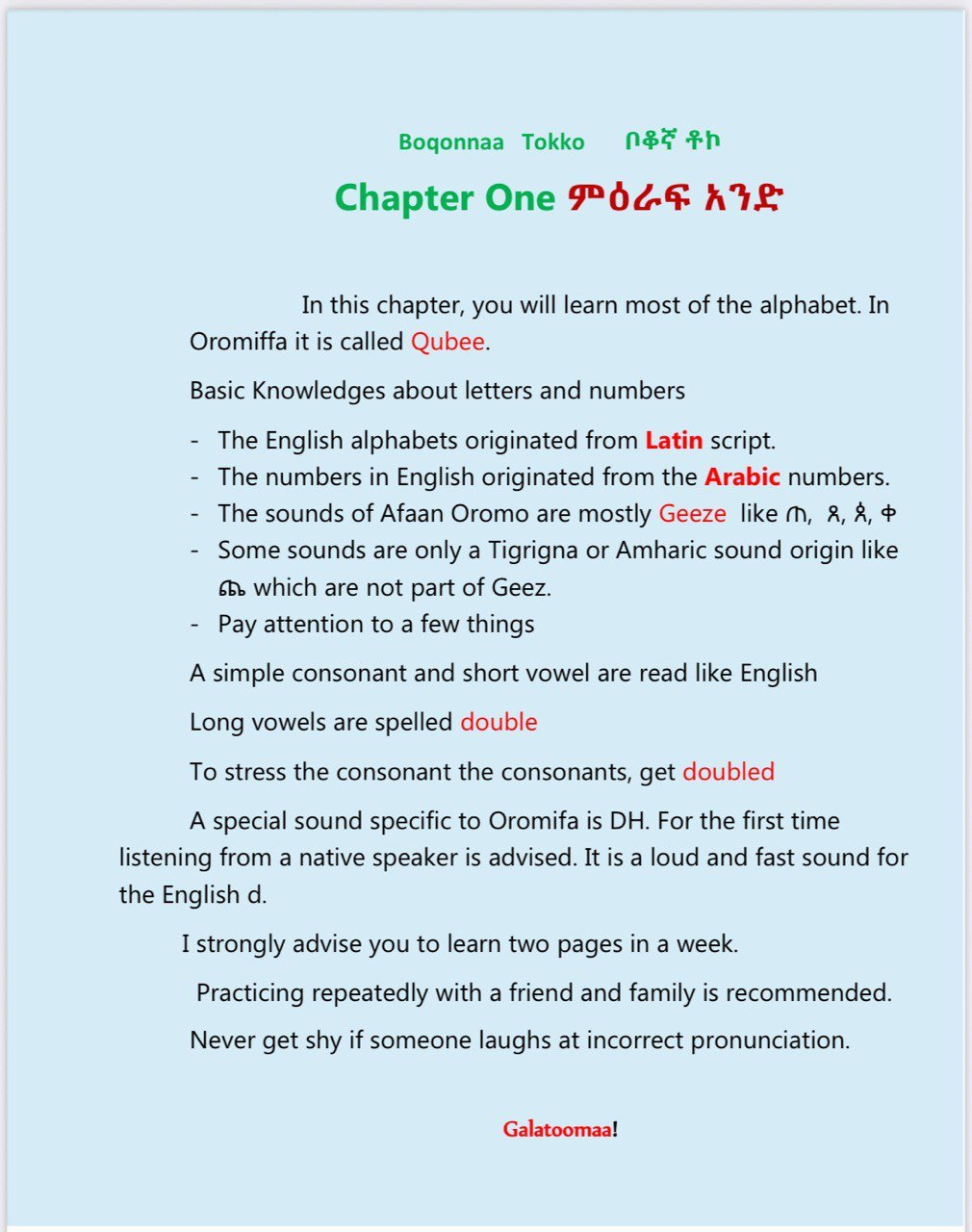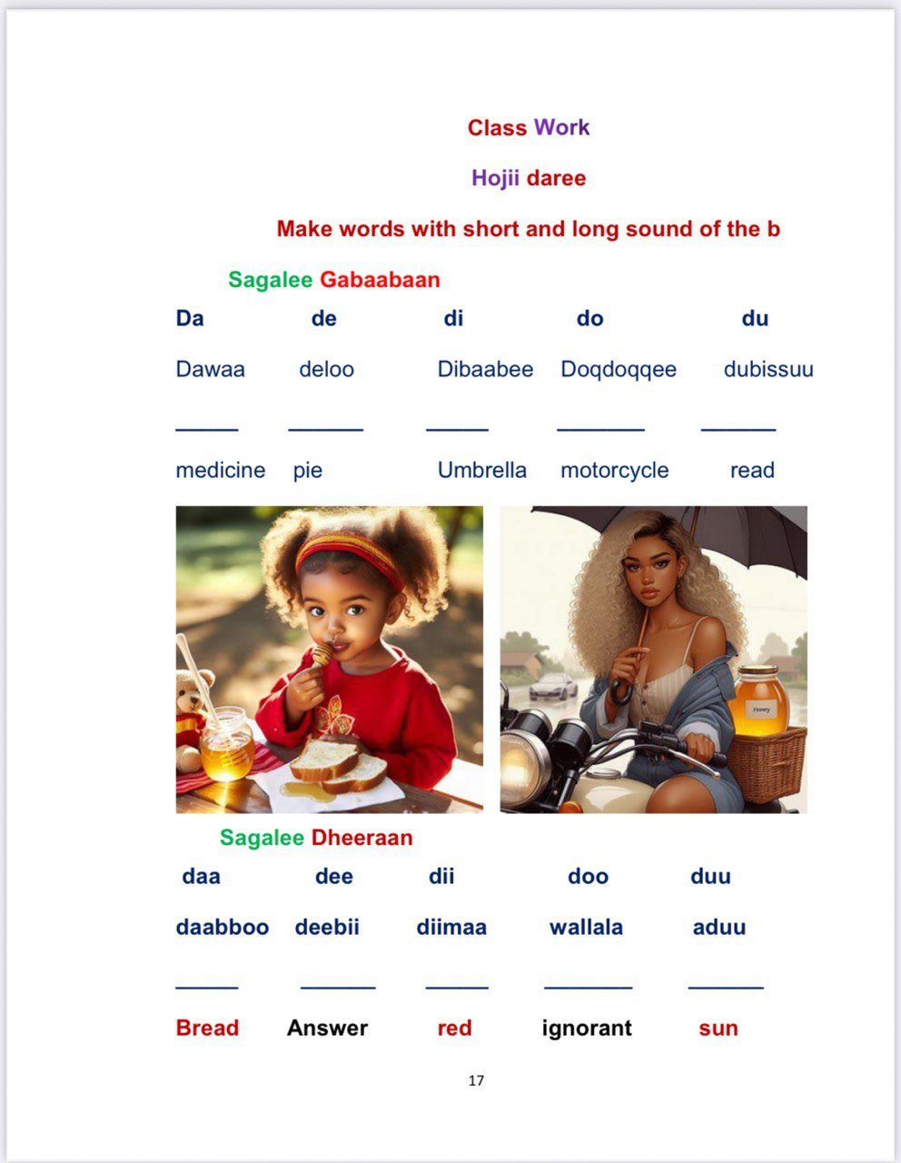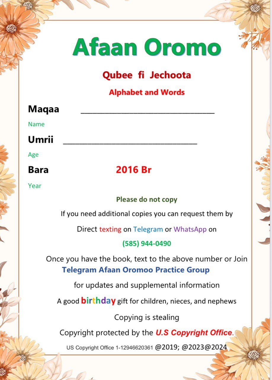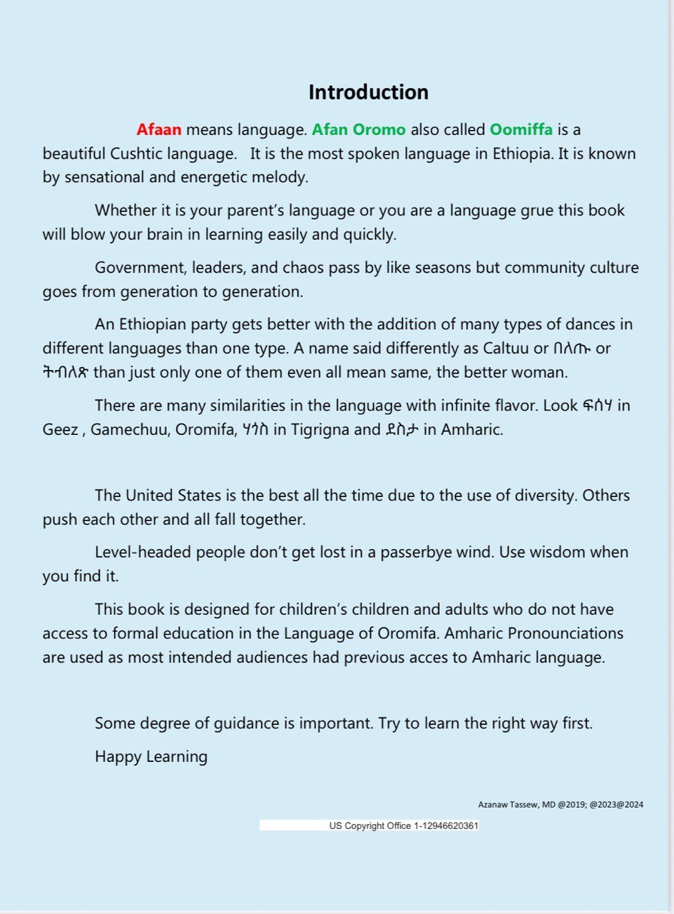 In this book, you will find the fundamental basics of the Afaan Oromoo language. It begins with how intonation affects writing and teaches how to write common words. This book serves as a foundation for an upcoming series on grammar. Additionally, subsequent books will be available to help children learn about their parents’ histories and traditions. The use of colorful words and pictures makes learning more engaging and visually appealing, enhancing the overall learning experience.