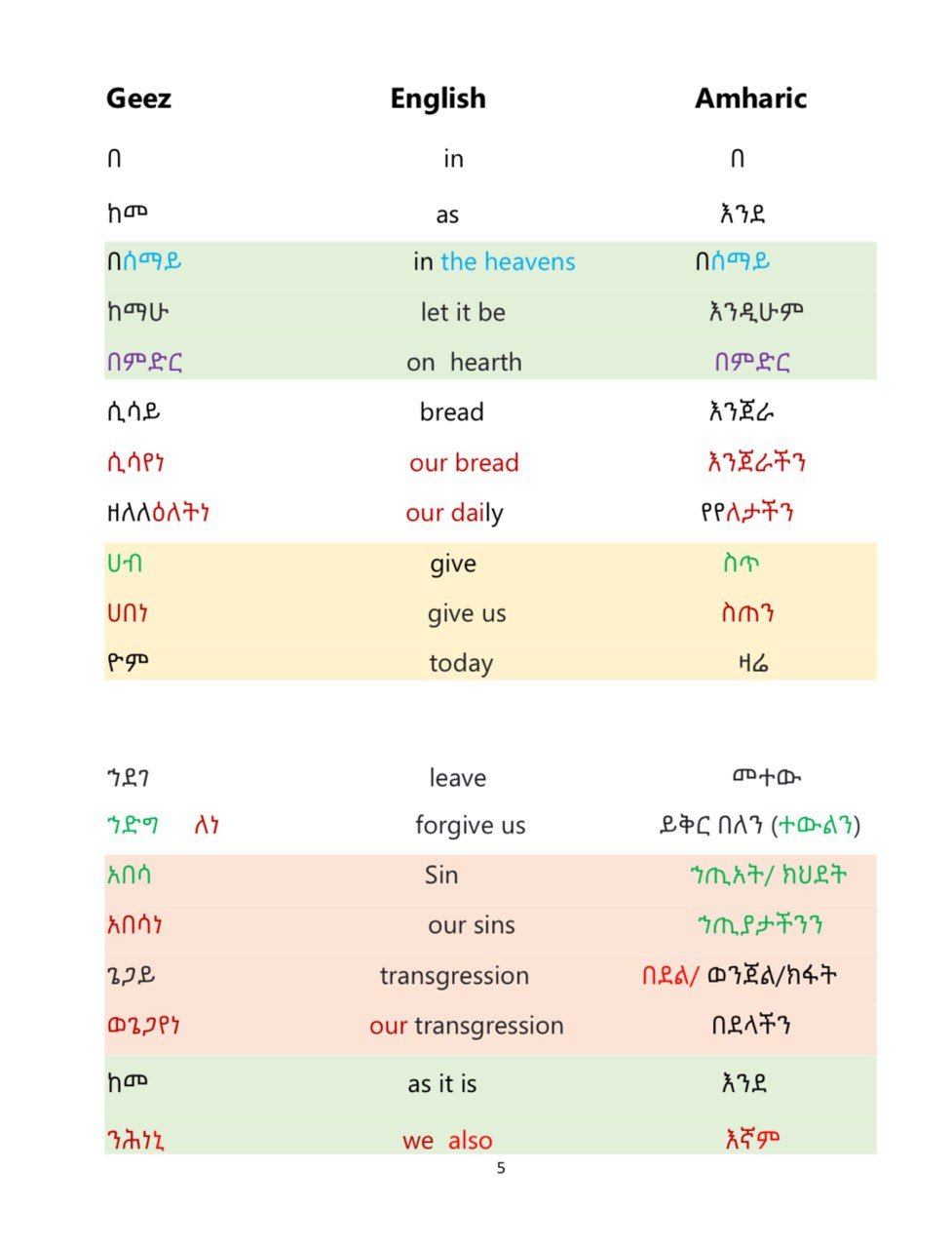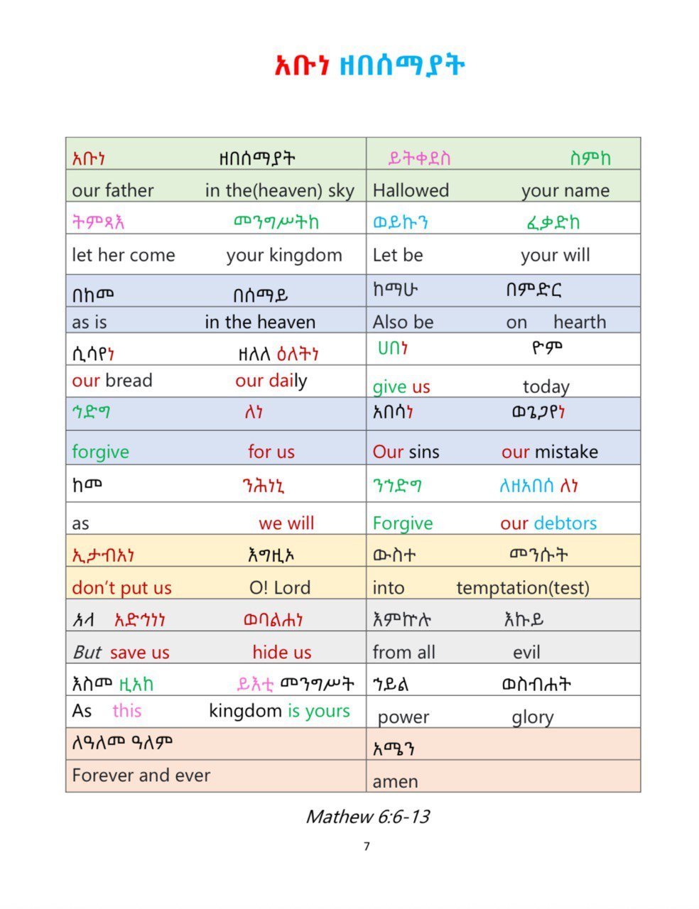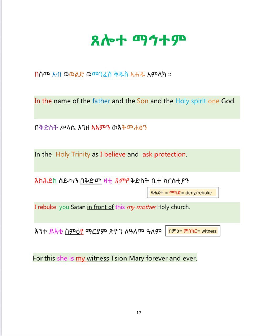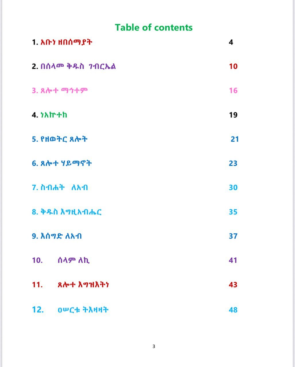 In this book you will get a simplified Amharic and English word for word of the daily prayers including አቡነ ዘበሰማያት, በሰላመ ቅዱስገብርኤል, ጸሎተ ማኅተም , ነአኵተከ , የዘወትር ጸሎት, ጸሎተ ሃይማኖት, ስብሐት ለአብ , ቅዱስ እግዚአብሔር, እሰግድ ለአብ, ሰላም ለኪ, ጸሎተ እግዝእትነ, and ዐሠርቱ ትእዛዛት.