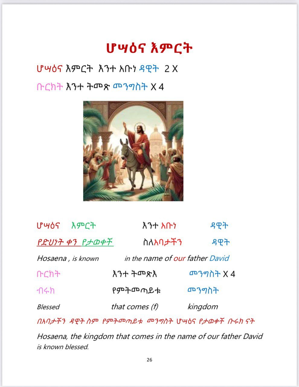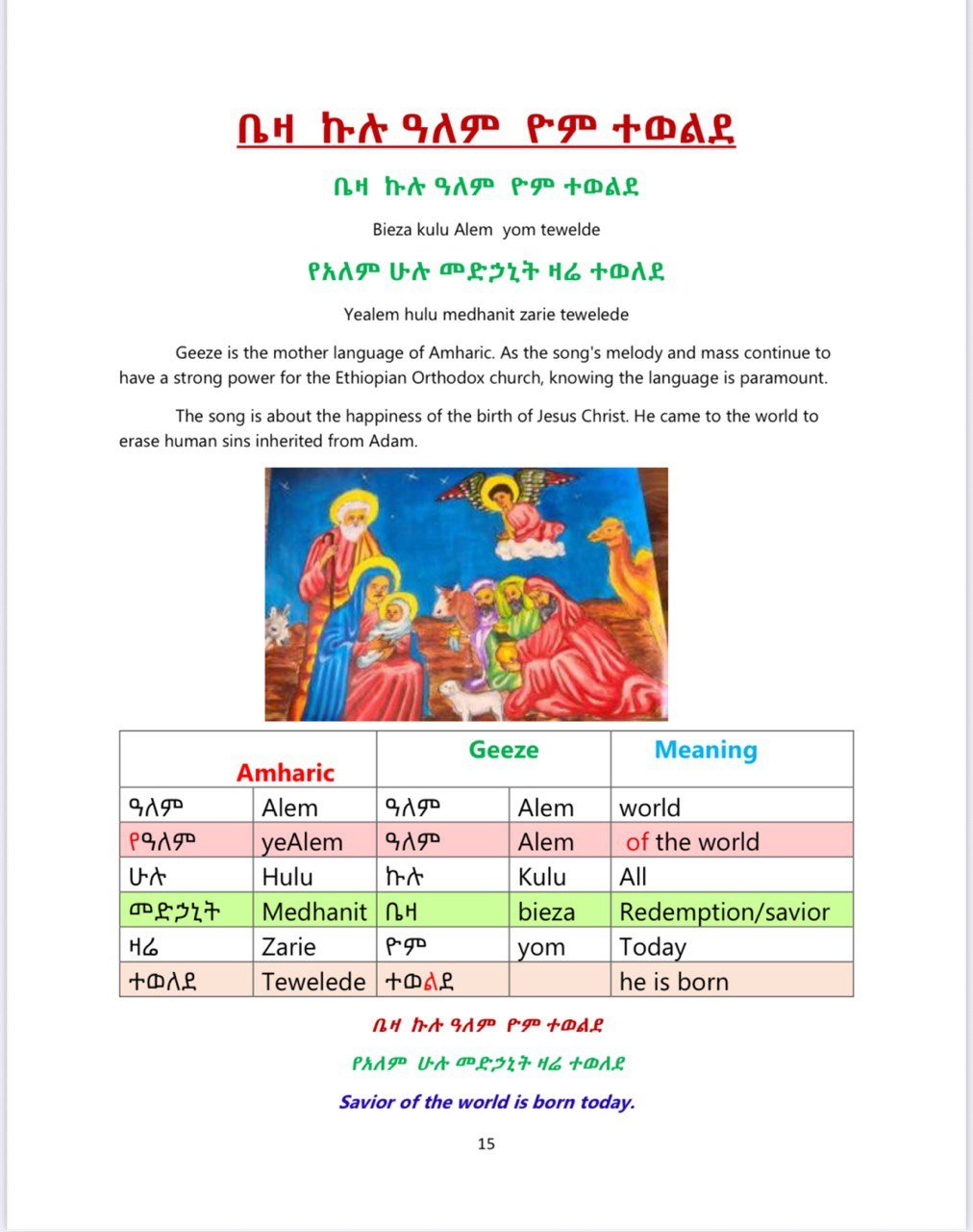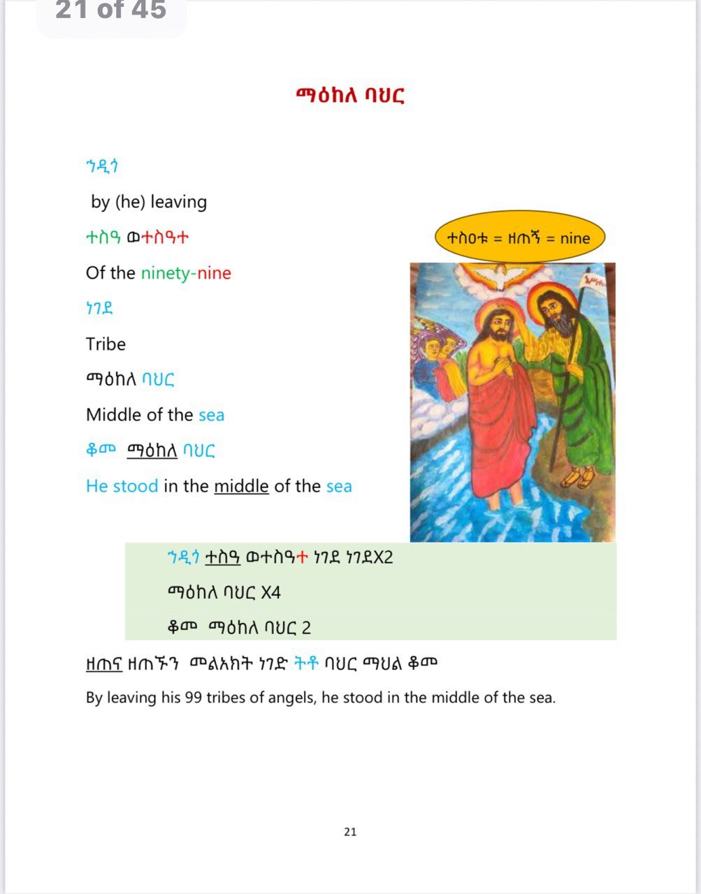 In this book, you’ll find the most commonly used Ethiopian Orthodox Tewahdo church children’s songs sung during the chorus. The word-by-word and summary translations make it easy to understand the meaning behind these songs.
