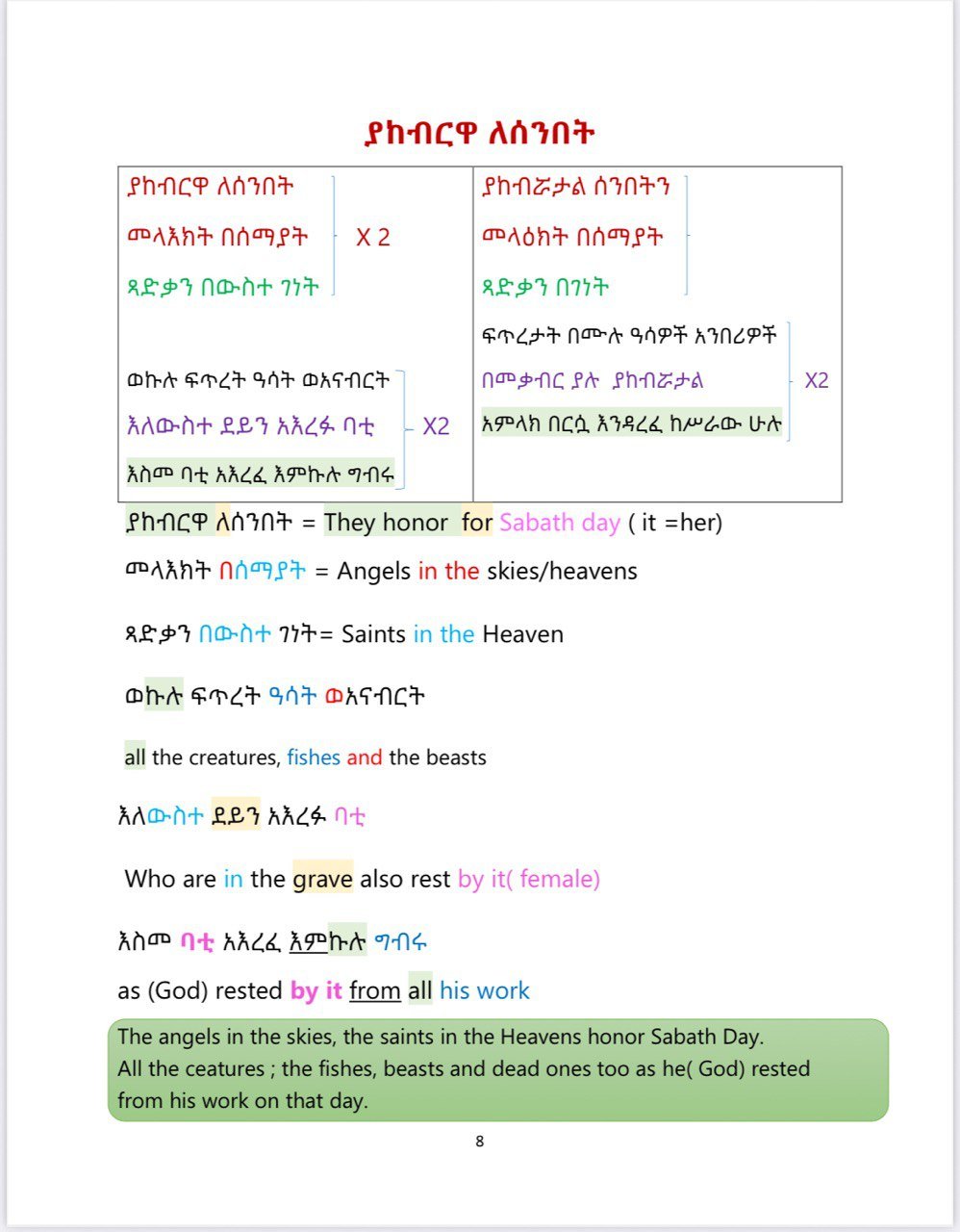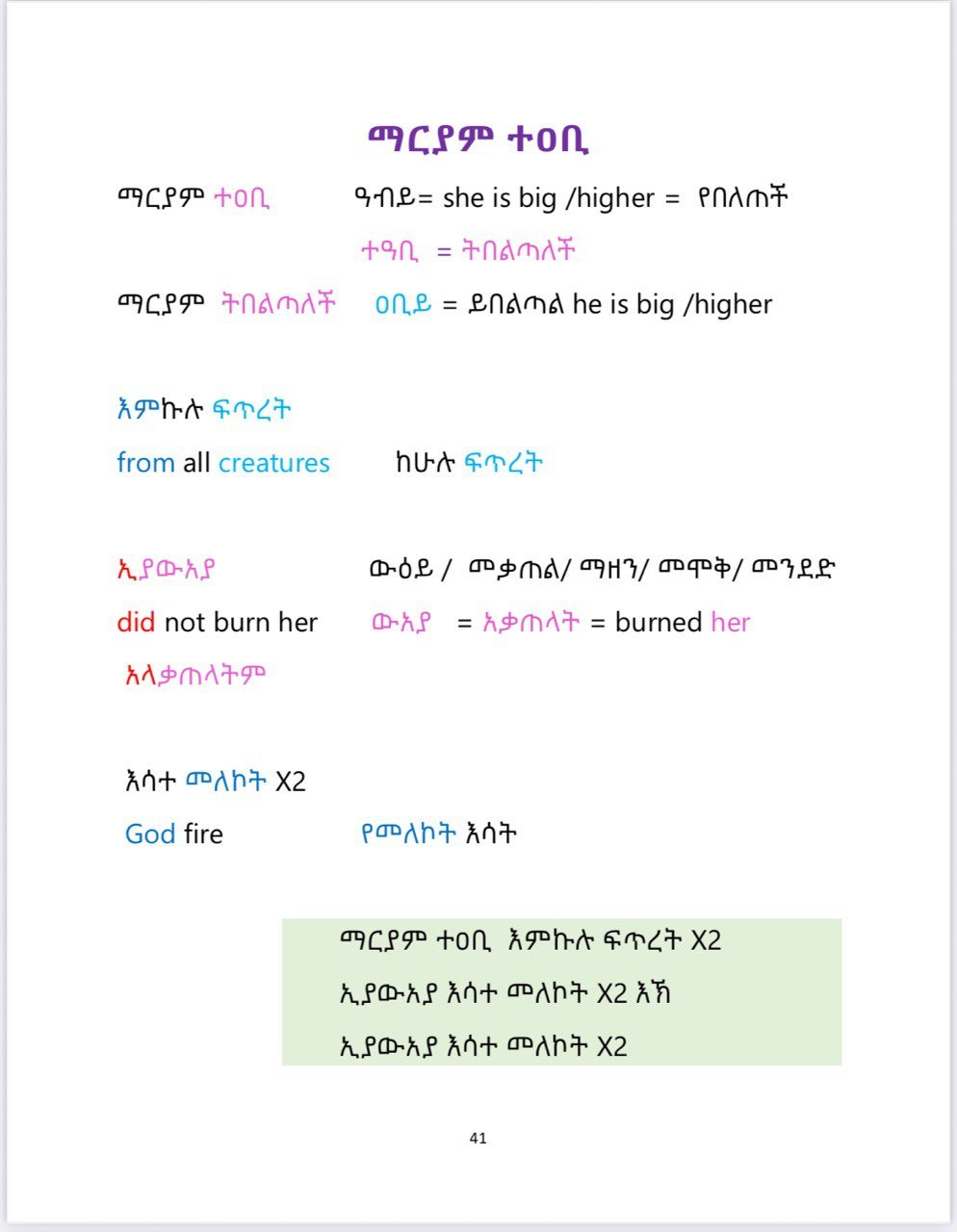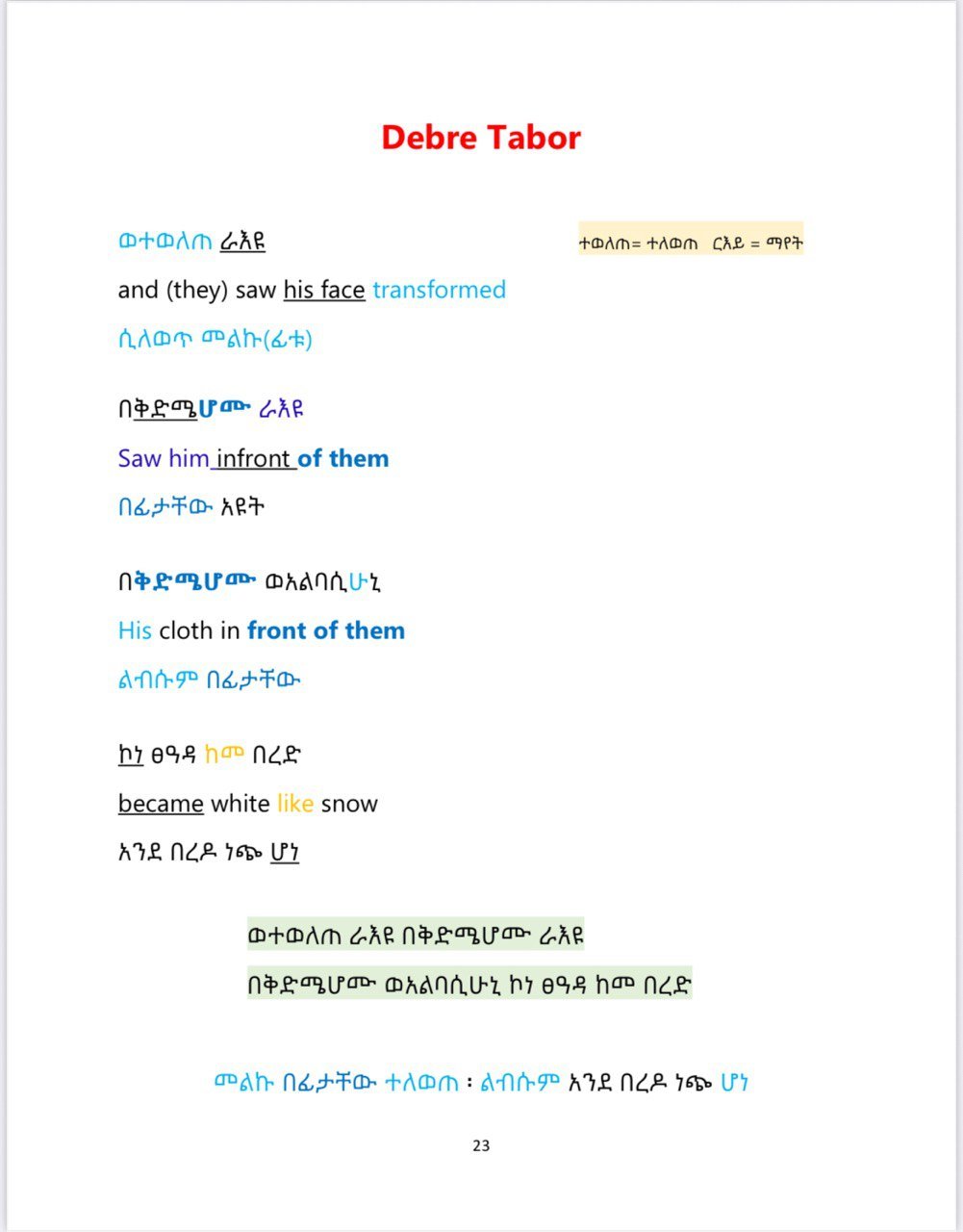 In this book, you’ll find the most commonly used Ethiopian Orthodox Tewahdo church children’s songs sung during the chorus. The word-by-word and summary translations make it easy to understand the meaning behind these songs.